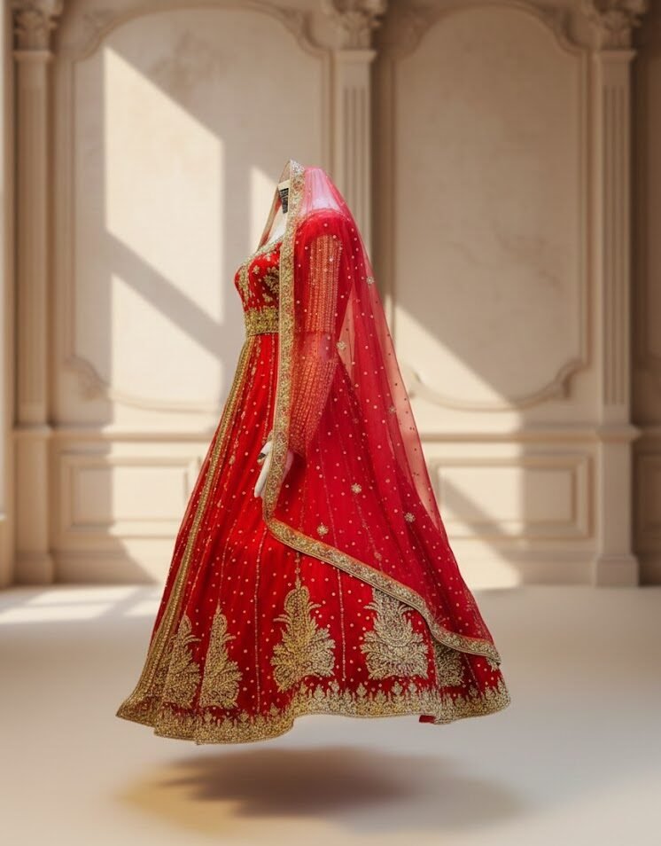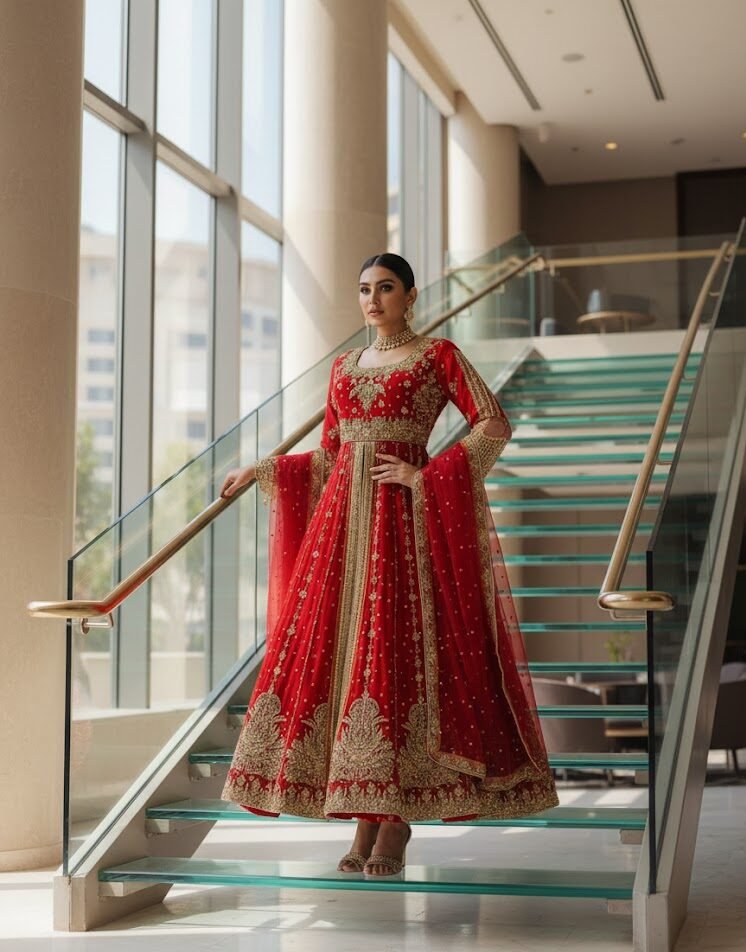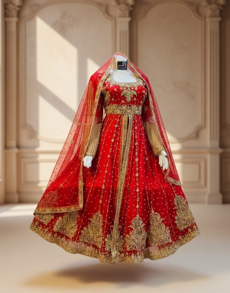 The flowing Anarkali silhouette ensures graceful movement, while the intricate embroidery across the bodice, sleeves, and hem reflects impeccable craftsmanship. Ideal for weddings, festive gatherings, or formal occasions, this dress embodies a timeless blend of tradition and sophistication, making every wearer feel like royalty.