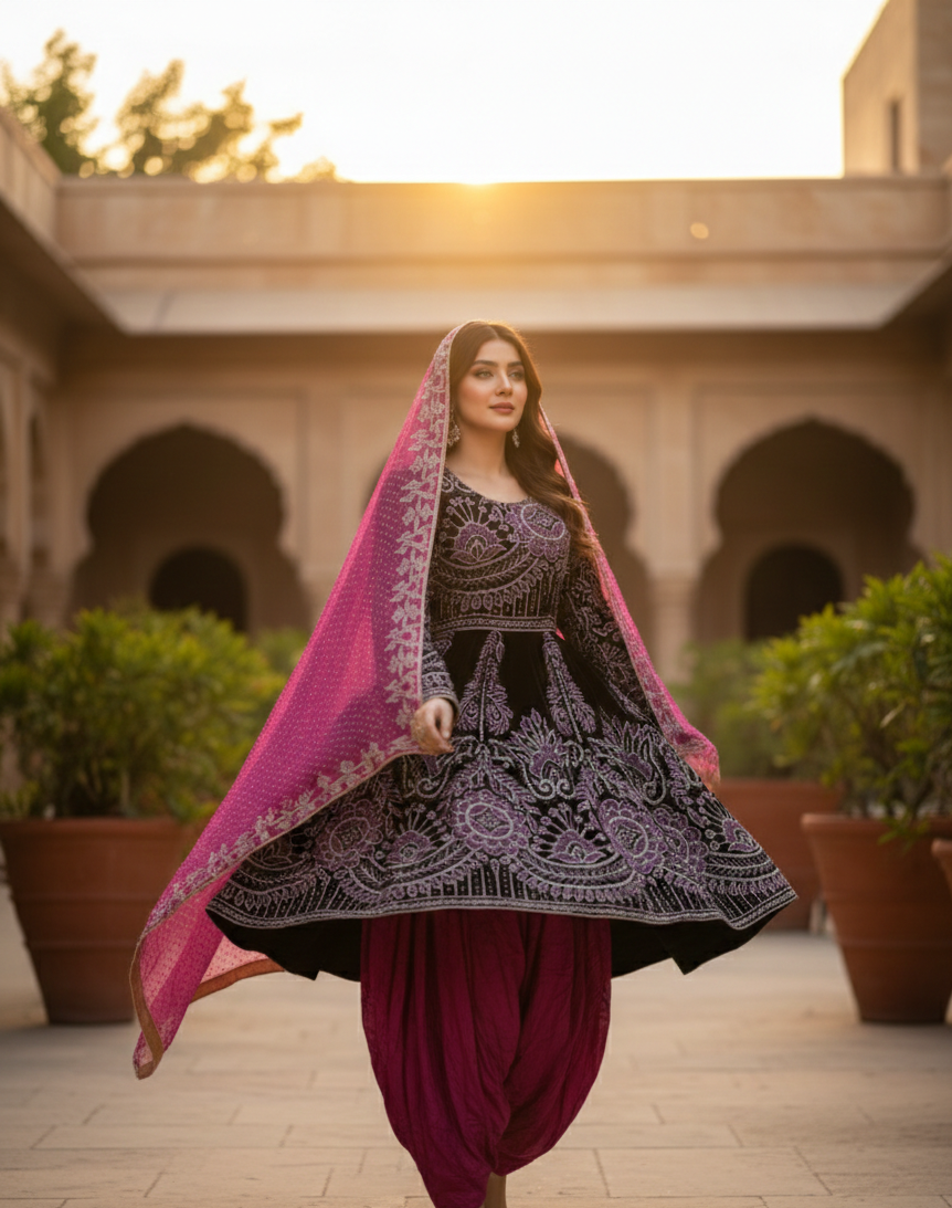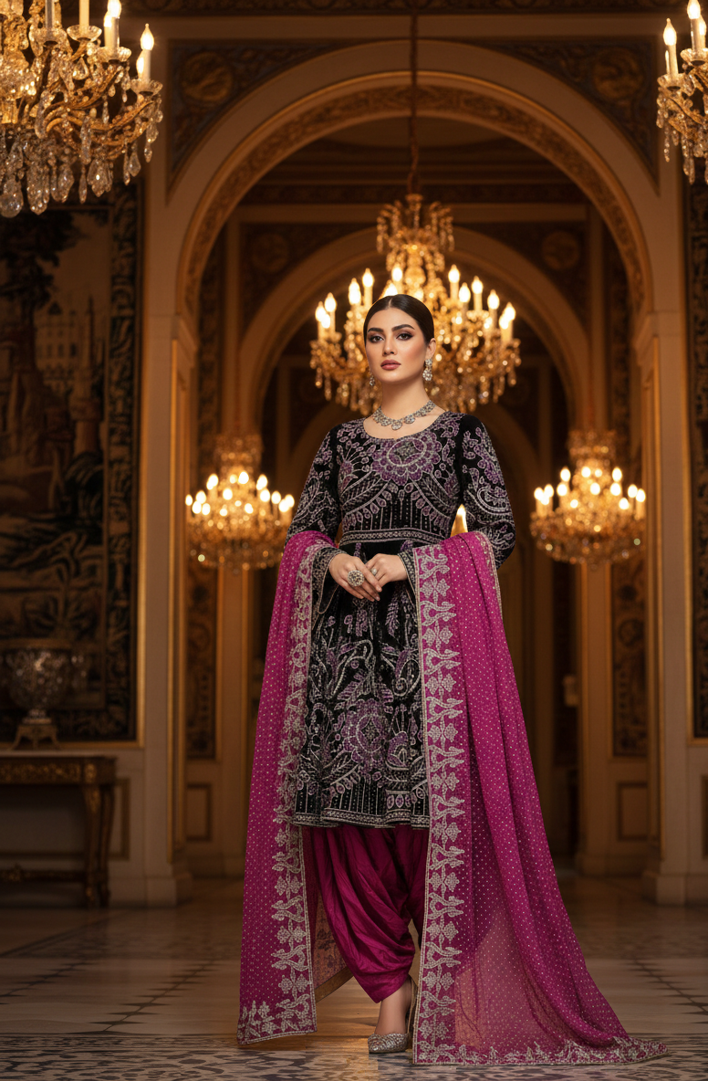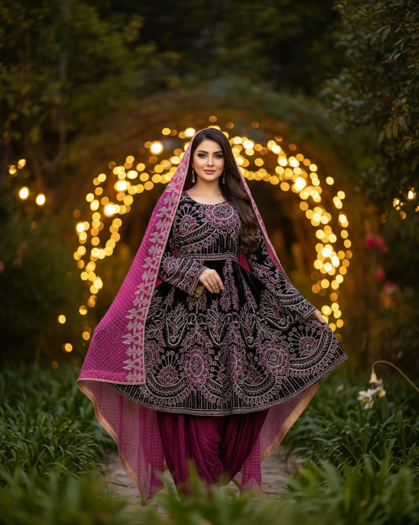 Inspired by authentic Afghan craftsmanship, this outfit blends traditional artistry with a refined formal silhouette. The detailed silver work adds a regal touch, while the deep black and magenta tones bring sophistication and grace. Perfect for weddings, formal gatherings, cultural celebrations, and festive events, this dress reflects heritage, beauty, and timeless style.