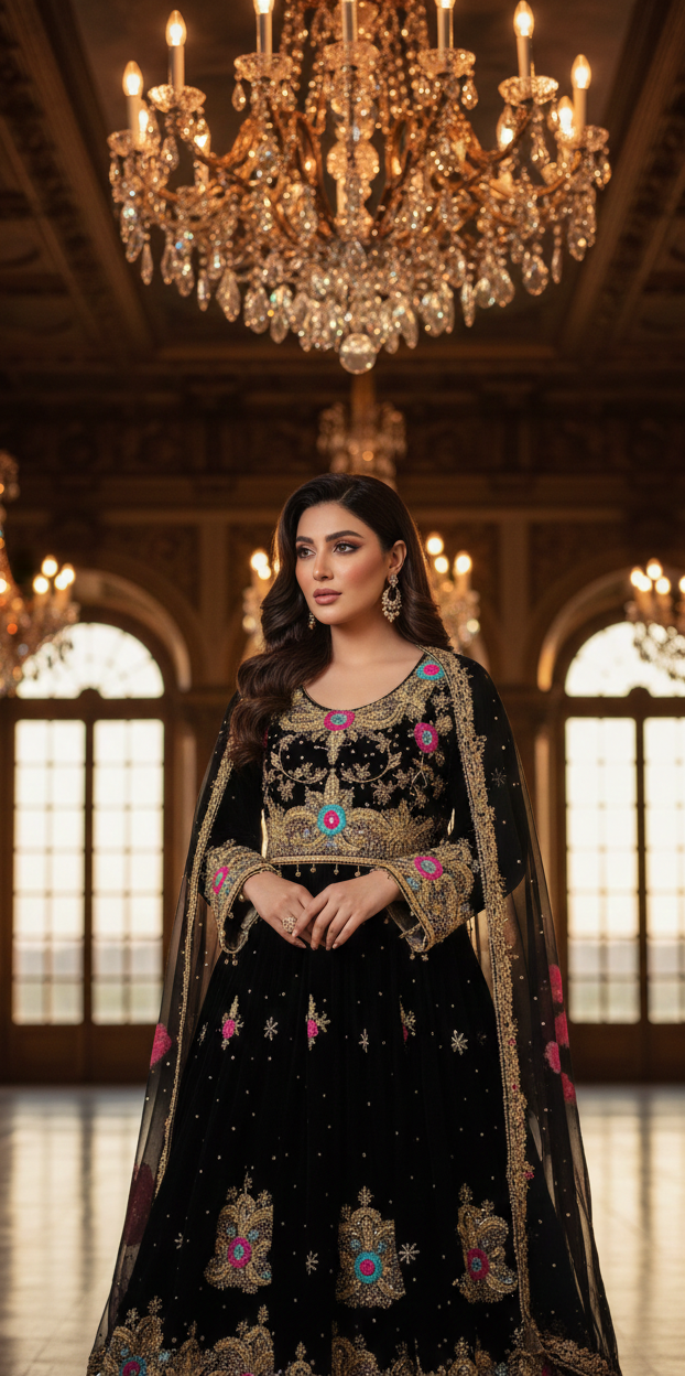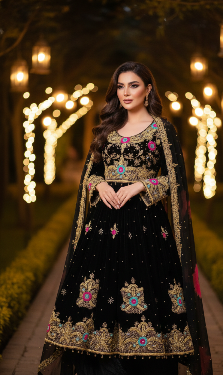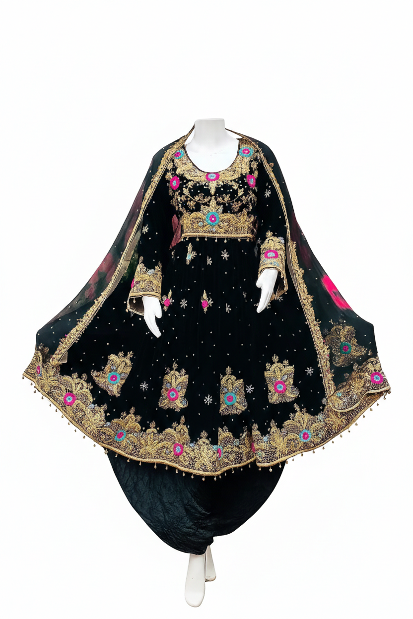 Crafted with traditional Afghan artistry, the dress showcases intricate detailing and a flowing formal silhouette that enhances grace and poise. The combination of black, gold, pink, and teal symbolizes royalty, celebration, and cultural richness—perfect for weddings, formal ceremonies, festive gatherings, and special events.