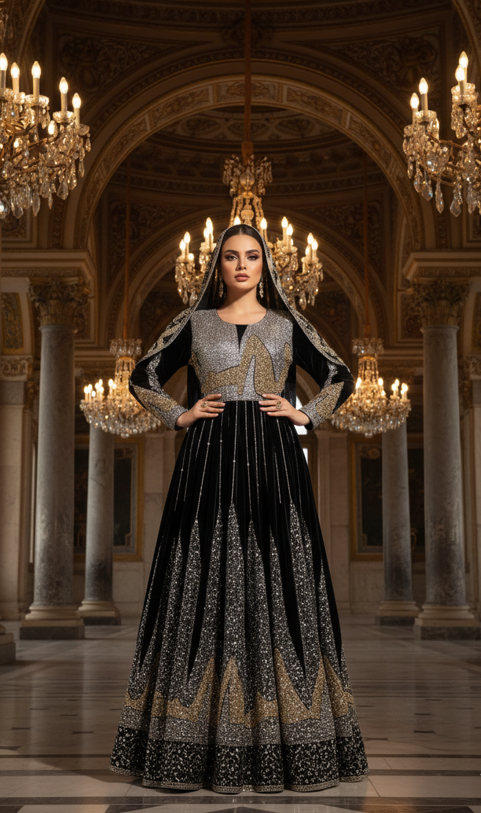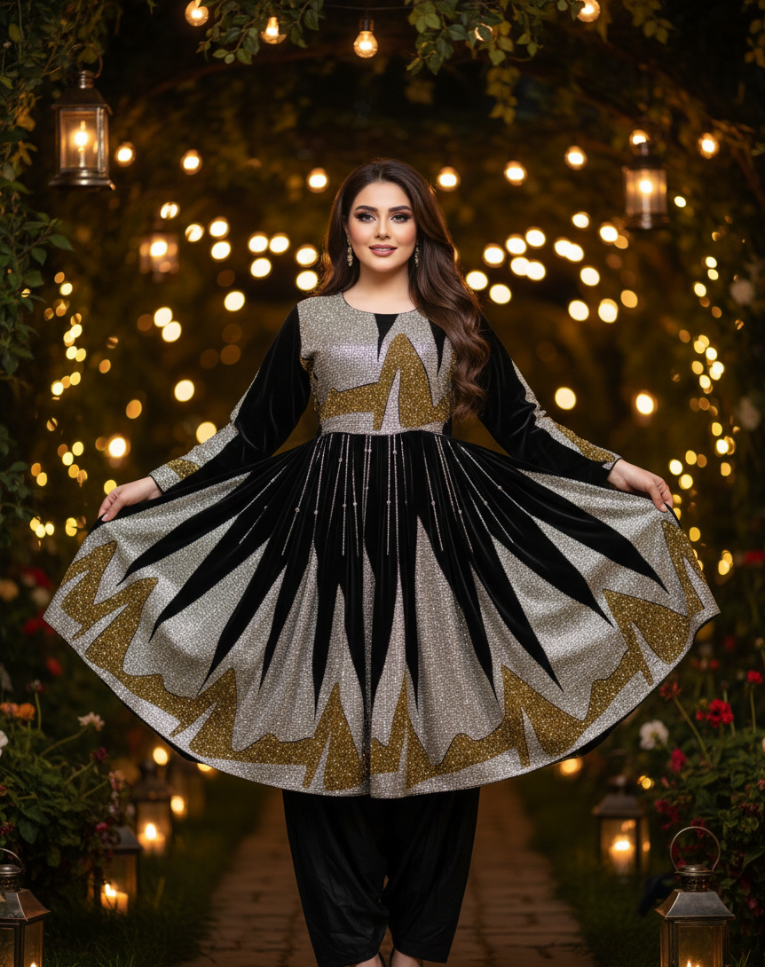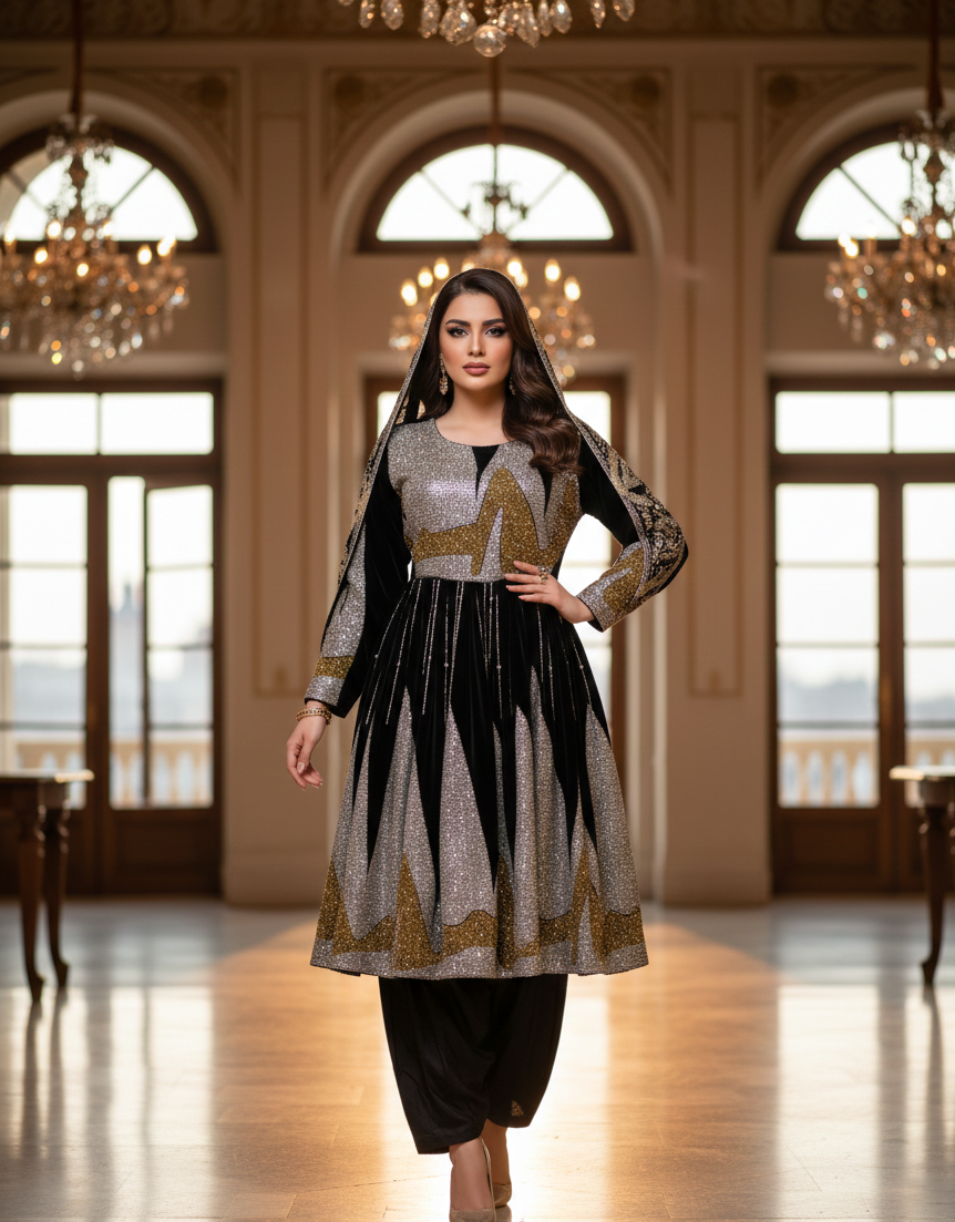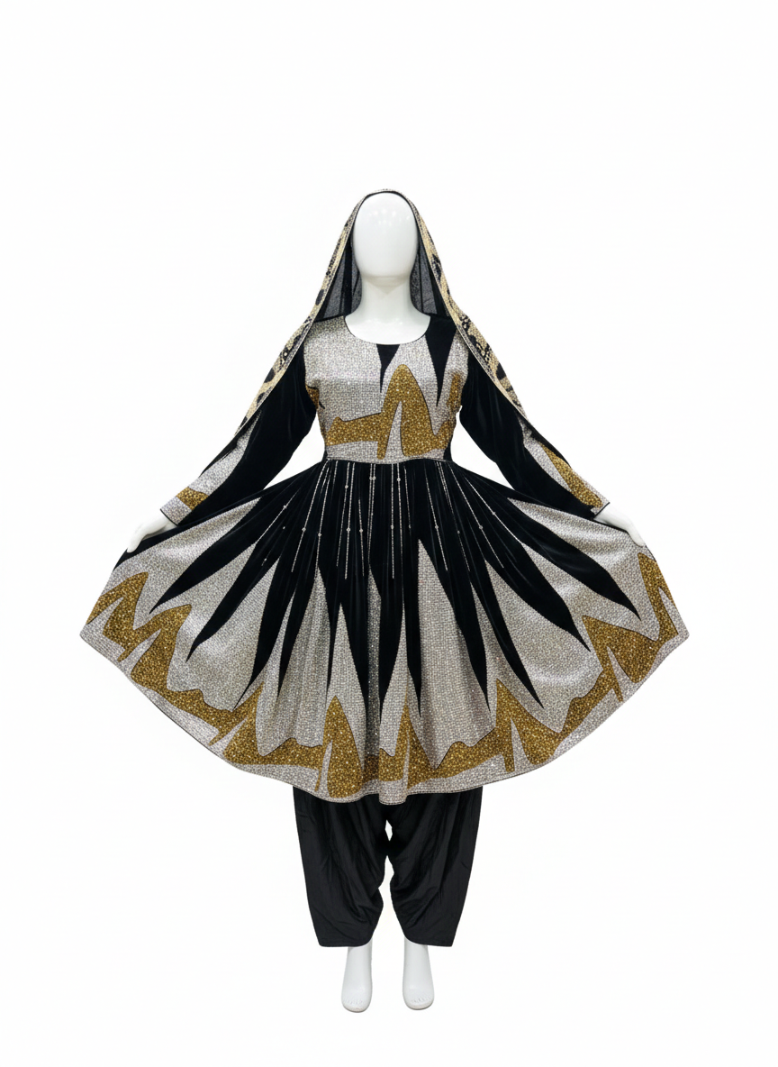 Inspired by traditional Afghan craftsmanship, the dress showcases intricate detailing and a flowing silhouette that enhances poise and grace. The combination of black, gold, and silver symbolizes prestige, luxury, and festivity—making it ideal for weddings, cultural events, formal gatherings, and special celebrations.