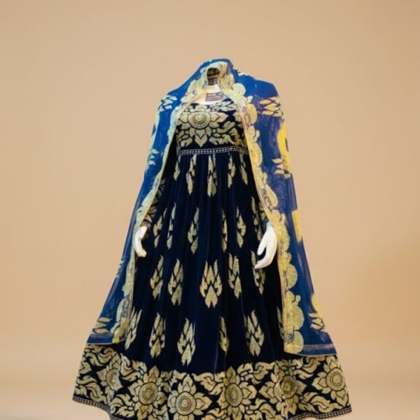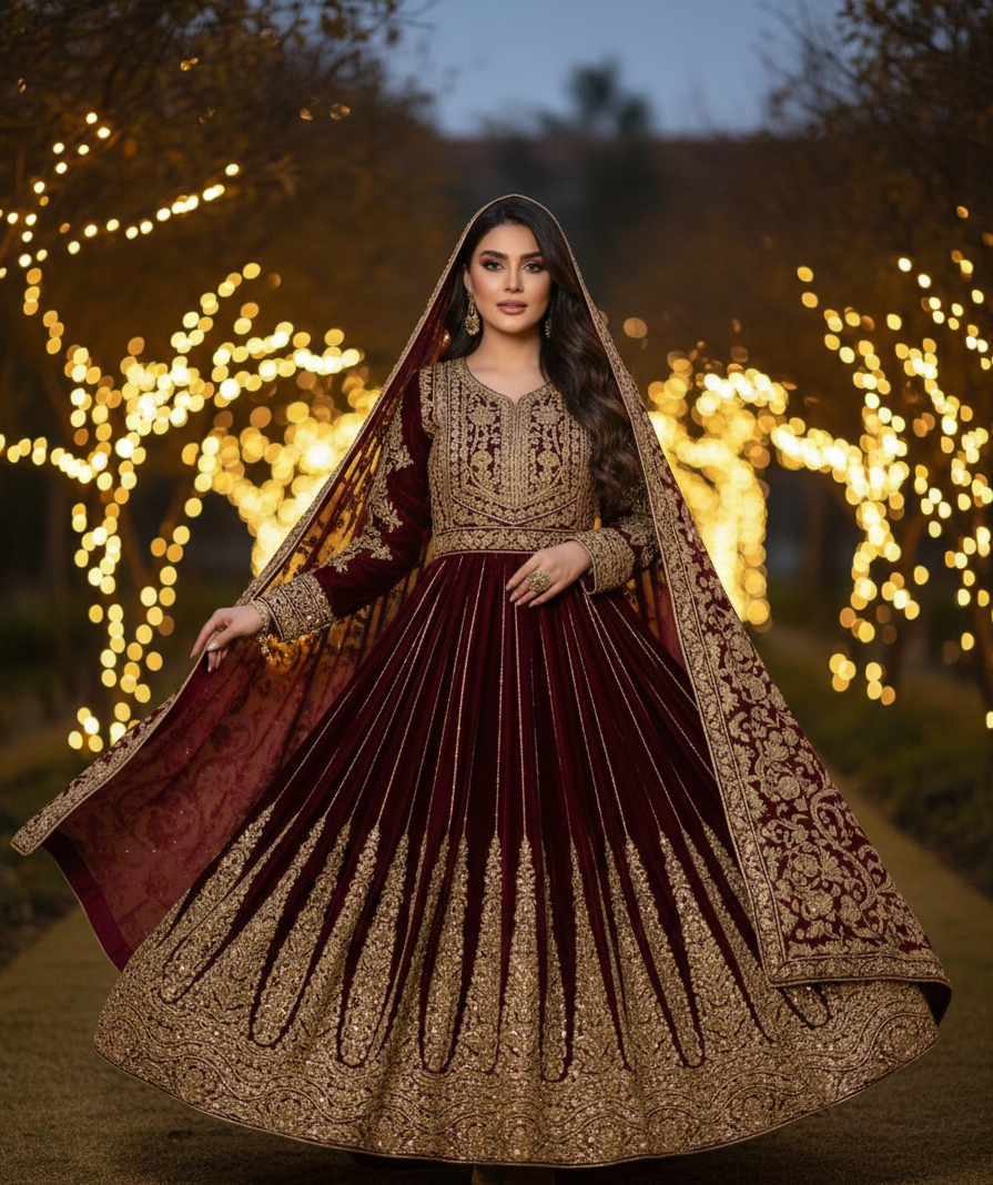 Crafted with authentic Afghan craftsmanship, the dress highlights intricate detailing and a flowing silhouette that enhances grace and poise. The combination of burgundy and gold symbolizes royalty, festivity, and cultural richness—ideal for weddings, cultural ceremonies, formal gatherings, and special celebrations.