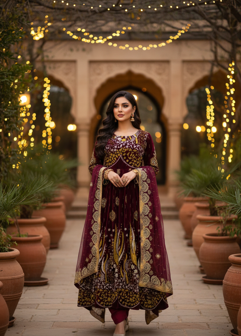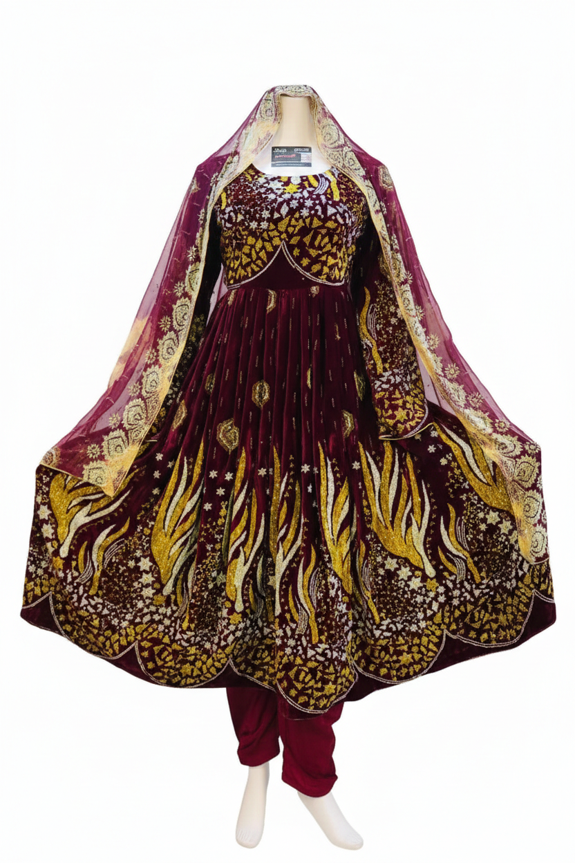 Inspired by authentic Afghan craftsmanship, the dress showcases refined traditional detailing and a graceful formal silhouette. The deep maroon tone symbolizes royalty and depth, while the gold accents add warmth and grandeur—making it perfect for weddings, formal gatherings, cultural celebrations, and festive events.
