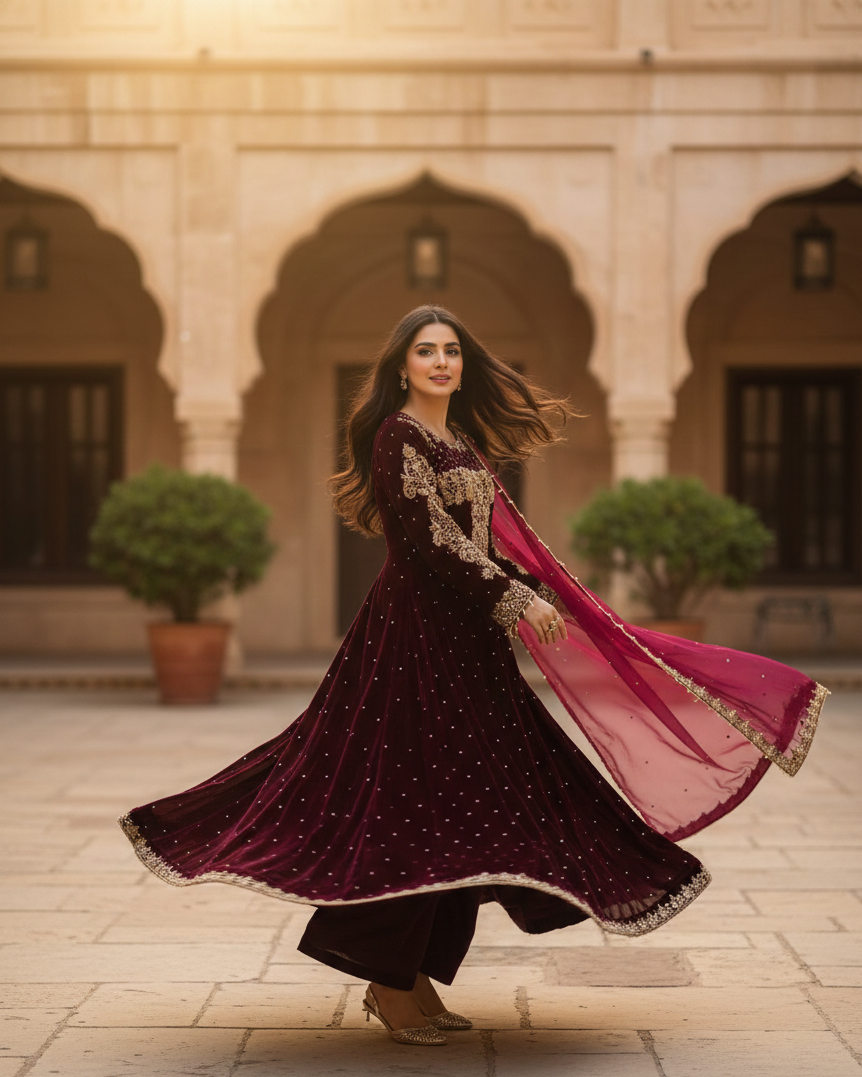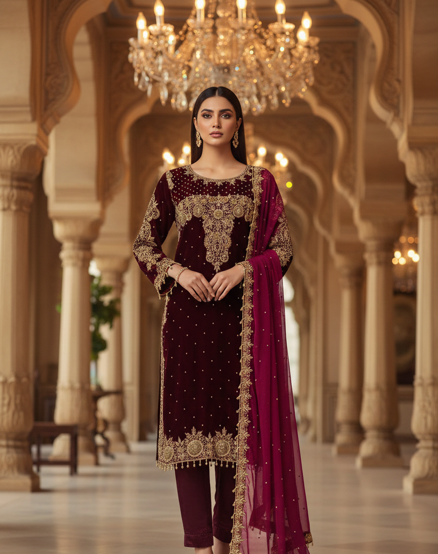 Crafted with traditional Afghan artistry, the dress showcases intricate detailing and a flowing formal silhouette that enhances poise and sophistication. The combination of maroon, gold, and magenta symbolizes royalty, festivity, and cultural richness—making it ideal for weddings, formal ceremonies, cultural gatherings, and special events.
