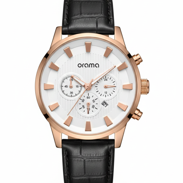 ORAMA Men’s Watch – White Dial with Rose Gold Case & Markers, Black Leather Strap (Quartz)